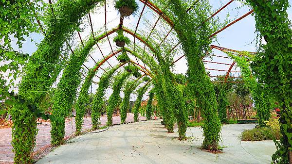 高度六公尺,全長210公尺的竹廊,有許多綠色的植物:例如錦屏藤及九重葛等等...